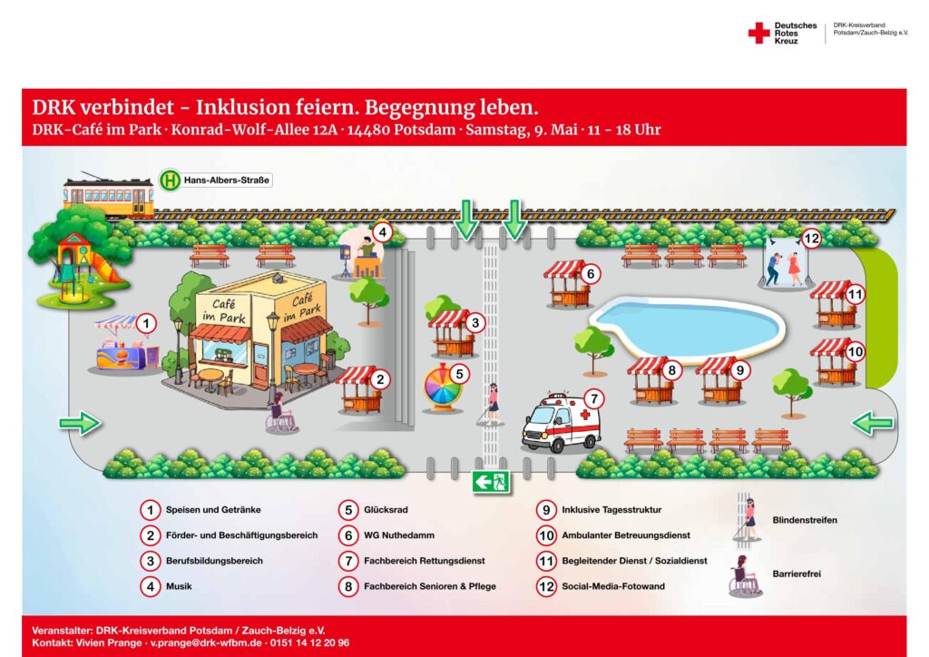 Unter dem Motto „DRK verbindet – Inklusion feiern. Begegnung leben“ veranstalten die DRK-Werkstatt Potsdam sowie der DRK-Kreisverband Potsdam/Zauch-Belzig am 9. Mai von 11 bis 18 Uhr eine Inklusionsfeier im DRK-Café im Park in Drewitz. Vorbeikommen lohnt sich!